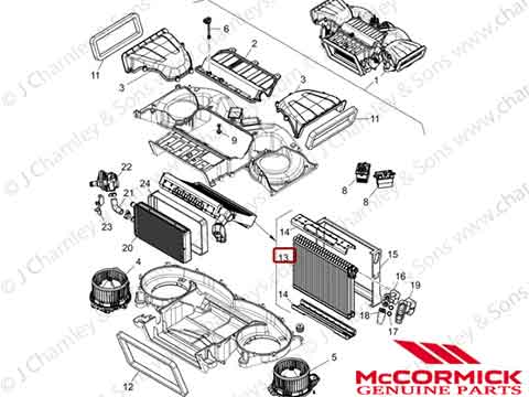 6647385A1 A/C EVAPORATOR. Genuine McCormick air conditioning system evaporator assembly for McCormick X6.4, X7 and X8 series tractors.